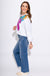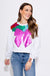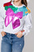 Celebrate the season in style with this grey cropped sweatshirt featuring a festive metallic wreath adorned with a large bow. Vibrant shades of pink, gold, red, green, blue, and purple add a lively touch to your holiday wardrobe. Its cozy fit and eye-catching design make it perfect for spreading cheer while staying comfortable.