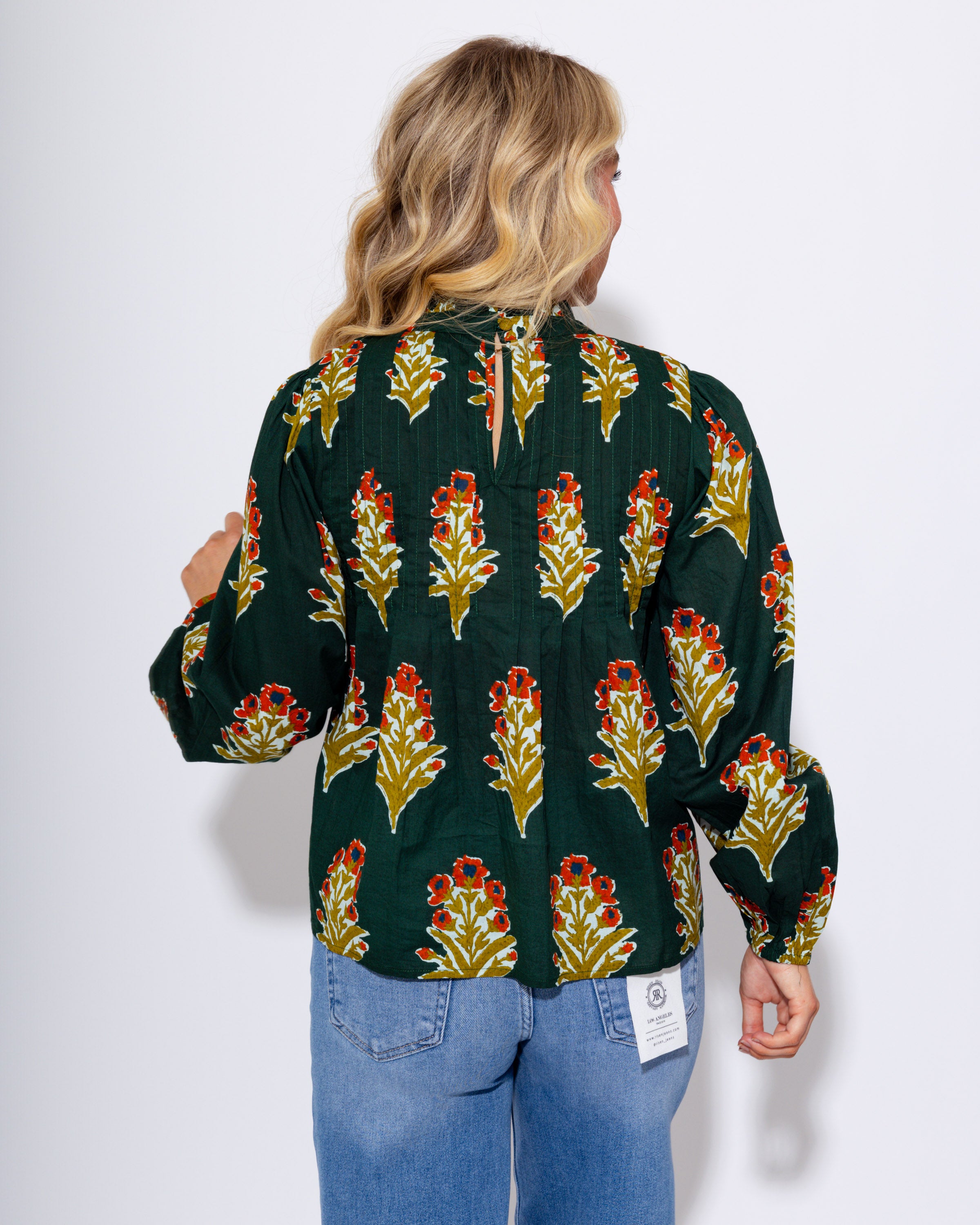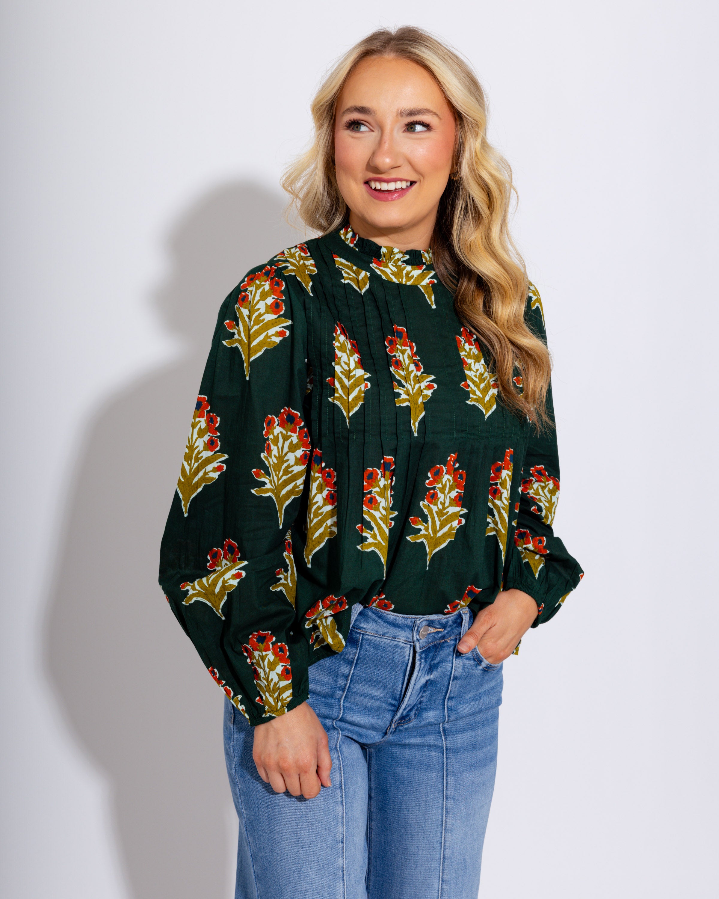 A romantic touch for your wardrobe, this green blouse features soft pleats and delicate ruffles around the neckline. The pink floral print adds a feminine charm, while the long sleeves keep it effortlessly elegant. Perfect for dressing up with trousers or pairing with denim for a chic everyday look.
