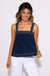 Transform your everyday style with our Navy Stitchline Cami Top. Crafted from premium cotton woven fabric, this sleeveless essential showcases elegant top-stitch detailing throughout for distinctive texture. The flattering square neckline and elasticated back ensure the perfect fit, while charming button details at the straps add a touch of sophistication. With its relaxed silhouette, this versatile top effortlessly transitions from casual daywear to evening elegance.