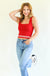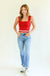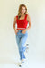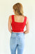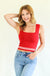 The Striped Square Neck GAMEDAY Top in Crimson features a knitted brami design with a wide shoulder strap and a square neckline, giving it a cropped look.