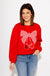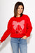 Elevate your casual wardrobe with this standout red sweatshirt featuring a large, eye-catching bow in classic red gingham print. Soft red velvet cherries add a playful touch, accented by shimmering gold sequins for the stems. Perfect for adding charm and warmth to your everyday style.