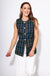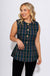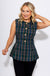 Elevate your layering game with this sleek sleeveless vest top in classic green plaid. Tailored for a flattering fitted silhouette, it features elegant gold accent buttons down the front and practical side pockets. Crafted from lightweight woven fabric with a smooth lining, this piece offers a polished, non-sheer finish.