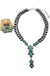 This western style silver tone burnished pearl necklace set has a scalloped butterfly stone concho pendant. The pendant conchos are dyed natural stone so they may vary slightly. The necklace measures approximately 18 inches in length with extender chain and lobster clasp. The matching earring measures approximately 1.15 inches In length.
