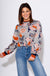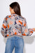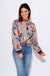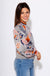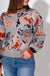 This long-sleeve knit sweater features a heather gray base adorned with bold abstract floral accents in pink, orange, gray, and navy. Its high neck and contrast-striped cuffs add a stylish touch while providing cozy warmth. Perfect for elevating your casual wardrobe with a distinctive, eye-catching design.