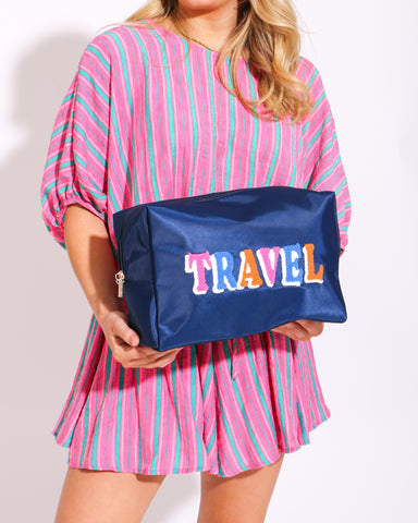 View full detailsThe "Travel" Oversized Zip Pouch is your ultimate travel buddy! With its roomy interior and bold, colorful chenille "TRAVEL" embroidery, this pouch...