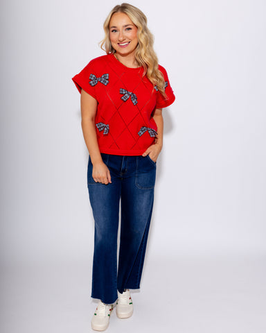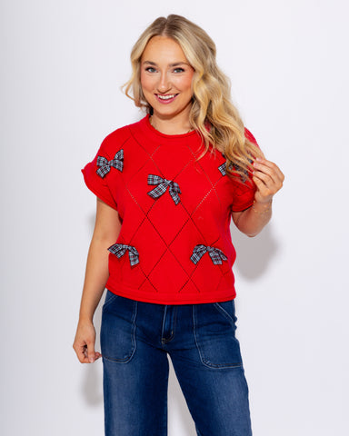 Elevate your wardrobe with the Bow Detail Checked Sweater, featuring a charming checked pattern in vibrant red and a delicate bow accent. This shor...