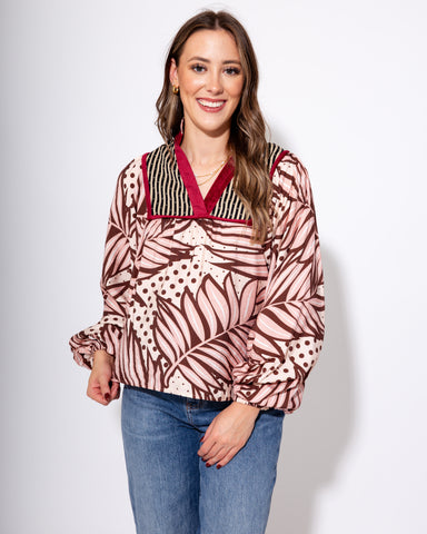 Say hello to the Burgundy Bloom Mix Top — a silky statement piece that does it all. Featuring a stunning mix of stripes, florals, and playful polka...
