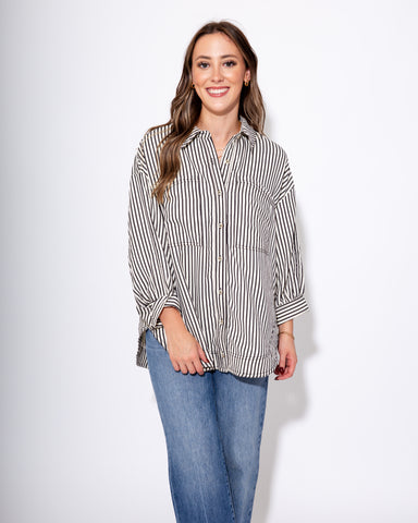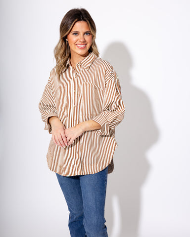 This brown button-up shirt features a textured stripe pattern and stylish reverse cuffs on its ¾ sleeves, adding a modern twist to a classic design...