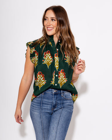 Elevate your wardrobe with the Floral Grove Flutter Top in vibrant green. Featuring delicate flutter sleeves and a charming floral detail, this top...