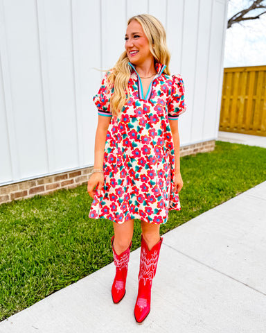 Get ready to turn heads in our Floral Print Ribbon Detail Dress in Red! This mini dress features a vibrant floral print, puff sleeves, and a front ...