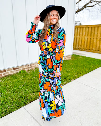 Elevate your style with our floral print smocked top! Set against a dark navy background, the vibrant orange floral print features pops of green, p...