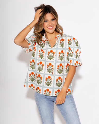 This vibrant Gingham Garden Glow Top in Orange will add a touch of fun to any outfit. Featuring a playful floral pattern, ruffle finish, and outer ...