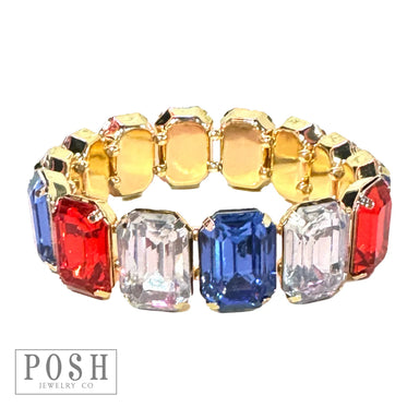 View full detailsThis bracelet has sparkling red, clear and blue rectangle shaped rhinestones prong set in a gold tone bracelet with little bead spacers. The bracel...