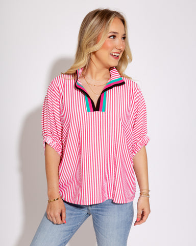 View full detailsIndulge in effortless style with our Wine and White Contrast Top. This striped pullover boasts structured short sleeves for added sophistication. T...