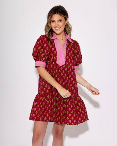 View full detailsDelicate and bold collide in this floral mini dress featuring soft pink blooms set against a rich burgundy background for a striking, romantic vibe...