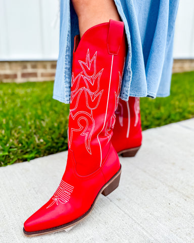 The Reba - our stunning red cowboy boots with intricate white tulip stitching adds a touch of elegance and flair that sets these boots apart. Const...