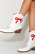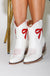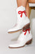 The Roseanne - a charming western touch to complete any outfit. This boot features a scalloped collar and easy pull straps, making it a breeze to slip on. The flattering silhouette, accented by a bold red bow, is a must-have addition to your wardrobe.