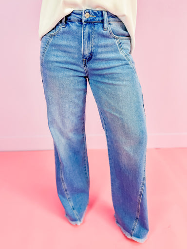 Get ready to rock the latest denim trend with our High Rise Wide Crop With Raw Hem jeans! These medium light wash jeans feature a leg opening of 21...