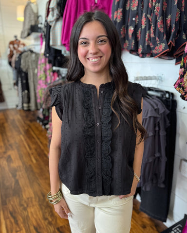 Elevate your everyday wardrobe with this charming ruffle trim button down top. Featuring a striking high ruffled neckline and delicate ruffle detai...