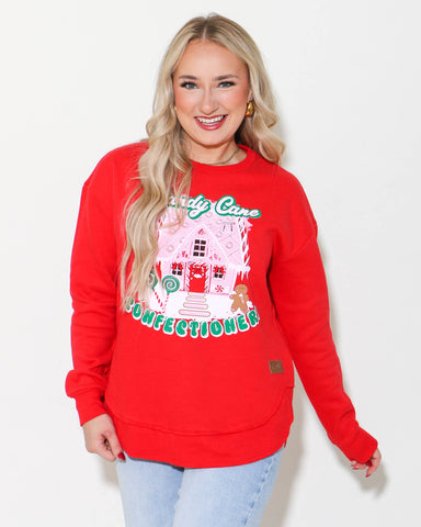 Get cozy in our Gingerbread House Red High Low Pullover! This festive sweater features a charming gingerbread house design and a flattering high lo...
