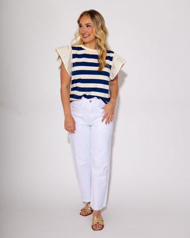 View full detailsCheer on your team in style with our Stripe Pop Flutter Sleeve Top! Bold horizontal stripes bring the energy of the crowd, while playful ruffle sle...