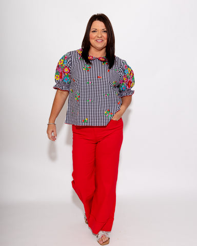 Bold meets beautiful in the Ivy Jane Gingham Garden Top. This black-and-white gingham stunner blooms with vibrant, oversized embroidered flowers al...