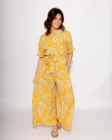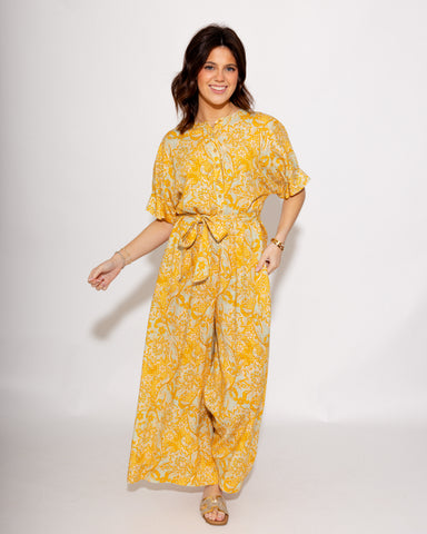 Bright, bold, and effortlessly chic, the Ivy Jane Tuck Sleeve Jumpsuit in a sunny yellow-gold hue is perfect for making a statement. Featuring tail...
