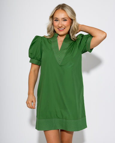 View full detailsEmbrace effortless style with this forest green mini dress, featuring a solid cuff band and charming short puff sleeves. The contrast stitch detail...