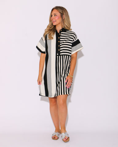 View full detailsUnleash your bold and confident style with our Mixed Line Mini Dress in Black! This collared dress features a flattering mixed stripe pattern and a...