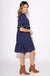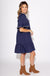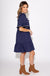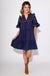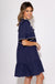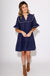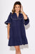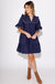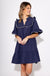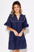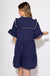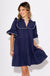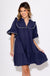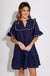 Step into effortless charm with this navy mini dress, featuring crisp white contrast scalloped stitching that highlights the tiered sleeves and split neckline with a playful, polished touch. The delicate scalloped trim adds a soft, feminine finish to the sleeves and collar, while the rich navy hue keeps it classic. Whether you're brunch-bound or headed to a garden party, this dress is made to flatter and stand out.