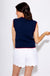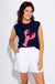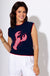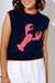 Make a statement with this navy sleeveless sweater top, featuring a bold pink and red crawfish graphic that captures coastal charm. The striking design is elevated by vibrant red contrast stitching trim that frames the neckline and armholes, adding dimension and visual interest. Perfect for layering or wearing solo, this piece brings personality and sophistication to any wardrobe. Ideal for those who appreciate unique, conversation-starting pieces with character.