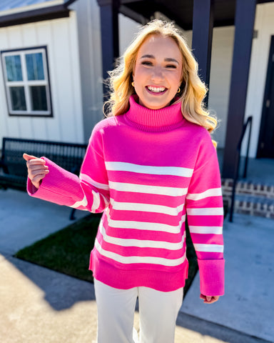 Wrap yourself in comfort and style with our Pink Striped Turtleneck Sweater! The folded high neck and long sleeves provide warmth, while the droppe...