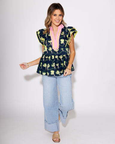 View full detailsThis navy peplum top brings the wow-factor with pops of playful neon! An abstract floral design bursts with energy thanks to neon yellow flowers an...