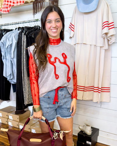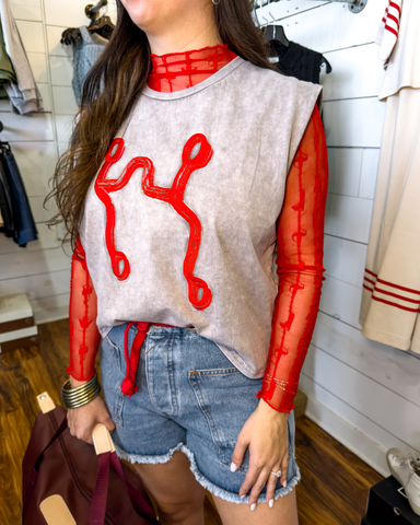 Layer this red sheer top for effortless versatility. Delicate lace lines create visual interest while playful Western graphics—cactus, cowboy boots...