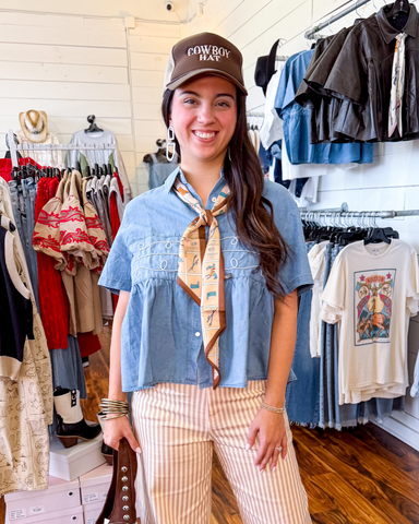 Saddle up in style with The Loopty Lou Denim Top, where Western charm meets contemporary flair. This flowy denim button-up features playful white l...