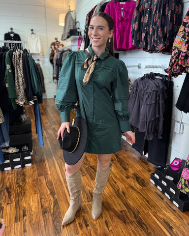 Embrace effortless elegance with this hunter green mini dress, featuring a delicate floral print and flattering puff 3/4 sleeves. The button-front ...