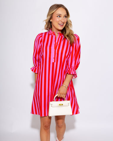 This playful striped mini dress is all about bold color and effortless charm. Designed with eye-catching pink and red vertical stripes, it delivers...