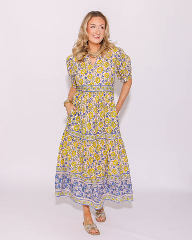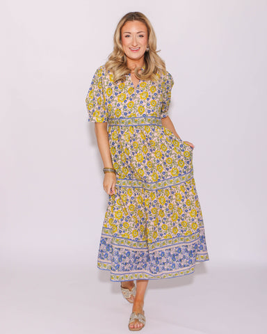 View full detailsIntroducing the Ivy Jane Banded Block Print Dress, perfect for spring with its stunning yellows and blues! This maxi dress is a must-have for any f...