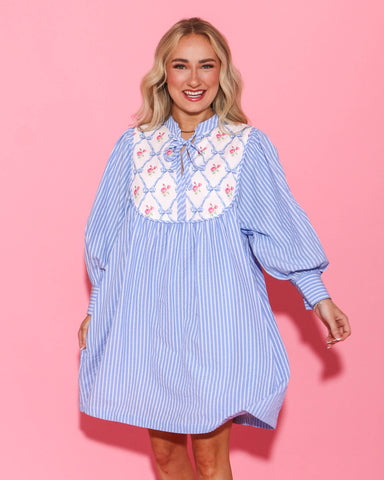 View full detailsFeel effortlessly chic in our Blue Striped and Floral Ribbon Print Dress! This pullover mini dress features a ¾ button closure cuff sleeve and a st...