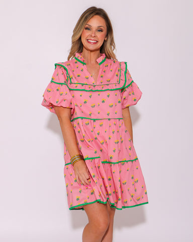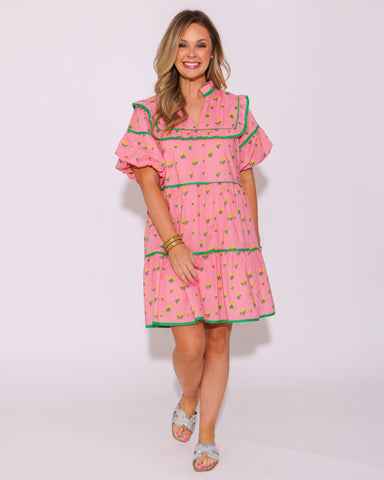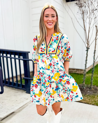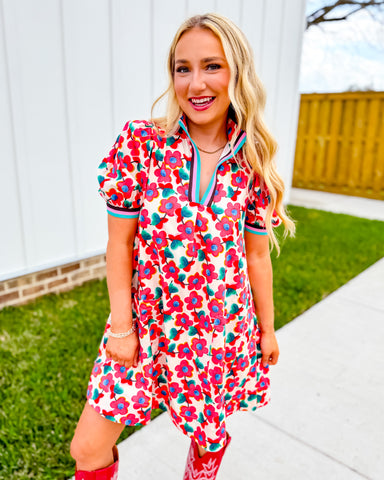 View full detailsIntroducing our Spring Fling Babydoll Dress! This charming dress features a lovely floral print and a ruffle-trimmed high neckline with a notched V...