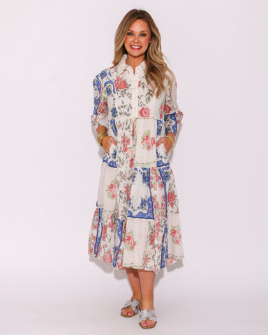 View full detailsIndulge in the beauty of the Ivy Jane Chiquita Dress! This stunning midi dress boasts a patchwork floral design and three quarter length sleeves, m...