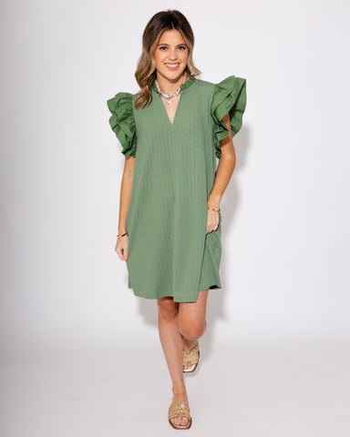 View full detailsA little texture, a lot of charm. This moss-colored mini dress features soft ruffled sleeves and a breezy silhouette with subtle texture throughout...
