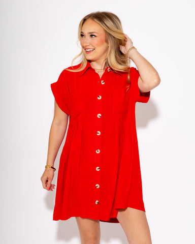 View full detailsStep into the school year with confidence and effortless style in our Cherry Pop Mini Dress! This casual dress, featuring a classic button-down des...