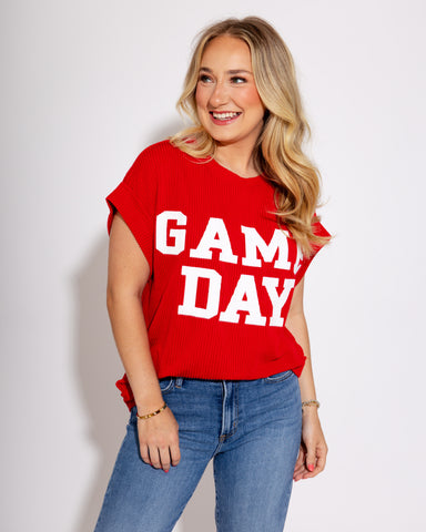 View full detailsBring the energy and the style with this oversized ribbed knit tee—your new game day MVP. Featuring bold “GAMEDAY” lettering across the front, roll...