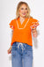 Bring the cute to kickoff with this flirty, feminine game day top! Designed with bold double-layered ruffle sleeves and eye-catching contrast scallop trim, it’s the perfect blend of playful and polished. The flattering V-neckline and relaxed fit make it ideal for cheering on your team in total comfort. Style it with denim, sneakers, or boots for a casual gameday outfit that’s as fun as it is fashionable. Whether you're tailgating or touchdown dancing, this burgundy beauty brings the team spirit and the style.