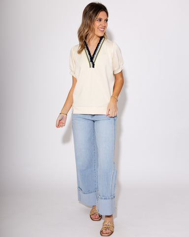 View full detailsElevate your wardrobe with the Lila Luxe Knit Ruffle Rib Band Top. Made from luxeknit fabric with a touch of stretch, this v-neck top features a de...