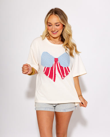 View full detailsShowcase your patriotic spirit with our Stars Stripes and Bows top. This vintage-inspired piece features a charming bow shape flag patch, complemen...