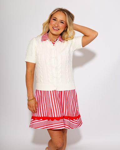 View full detailsThe Cable Club Button-Up Sweater Top — your ultimate game day MVP! Featuring a solid cable knit design and a sleek button-front closure, this short...