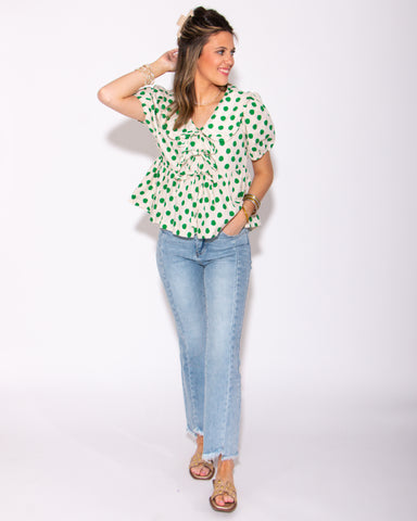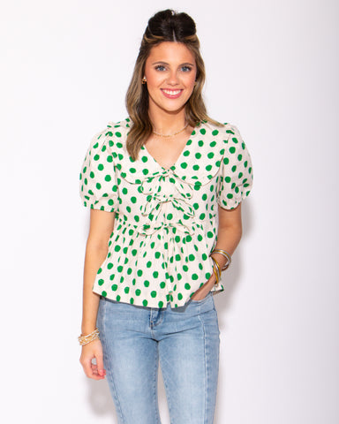 View full detailsThis cream peplum top with bright green polka dots is here to steal the show! The standout sailor collar adds a vintage-inspired twist, while the b...
