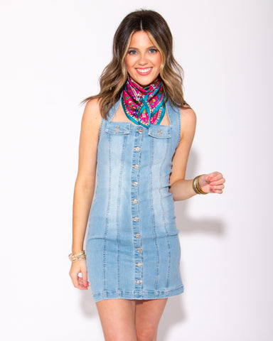 View full detailsUpgrade your wardrobe with our Denim Frame Mini Dress! This button-up dress features wide straps for a comfortable fit and a flattering frame. Tran...